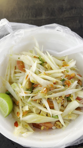 Good gyoza called stupid fries, great fruit. And if you get a chance to get some of the coconut drink at the stall that only offers two choices both for 25 Bath, double your order.