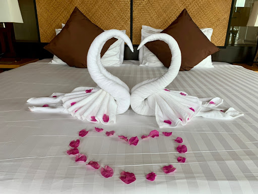 The beachfront room is spectacular for its views but the balcony is adjacent to the next room though fairly well designed there's no privacy. Bed was two single beds put together which is not on par with a honeymoon room. Bathroom is well designed and spacious. Excellent hot water and pressure.