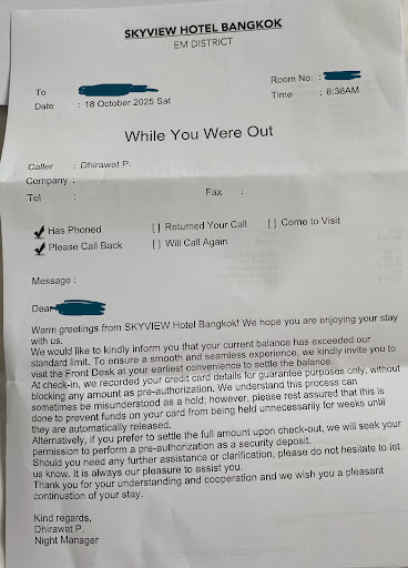 Read moreThis is a horrible, unsafe hotel and the worst place in Bangkok soi 24 providing horrendous customer service while gouging their price during the holidays. There are much nicer, cleaner, and friendlier hotels in the soi 24 area for the same price if not less. Just look at Google reviews and avoid at all costs. Skyview hotel and the front desk totally ruined my holidays and I'll never visiting Thailand again. 한국인들 여기 가지마세요. 방음 전혀 안되고 불친절하고 최악입니다. This place claims to be a five-star hotel but definitely a one-star place. The walls are paper-thin and it is so LOUD in the room, I could literally hear my next door talking on the phone. I had erratic next door guest banging on the wall at odd hours and the front desk refused to switch my rooms. All hotels (even 3 stars) always switched my rooms when such issues came up. I paid a gouged price while there was absolutely no redress. I suffered from paper-thin walls and erratic neighbors during the 5 day stay.