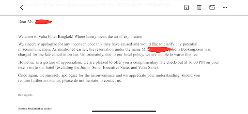 THIS IS WHERE IT GETS BAD. The biggest problem I have with this place is how it tries to scam you. We booked 2 nights thru Agoda. And we accidentally booked another 2 nights by mistake. We cancel the 2 nights by mistake yet they still charge us half of the price for it. We talked to the front receptionist. And they told us to talk thru Agoda. Agoda confirms with us that they didnāt charge us anything and that itās the hotel itself charging us for the cancellation fee. The funny thing is⦠the hotel reception clearly told us that they wonāt charge us as long as Agoda agrees. Yet now they wont refund the money even tho Agoda itself claims to have nothing to do with it. And my bank statement proves that itās the hotel that wonāt return the cancellation fee because it didnāt go thru Agoda but Valia hotel itself. THIS IS THE PART THAT DOSENT MAKE SENSE. @@@ If the hotel has no intention of returning the cancellation fee then why bother telling us to go talk to Agoda in the first place?!?!?!?!? Why waste my time and Agodas time when they can just admit that they charged us for the cancellation and not Agoda. Even after multiple email. The hotel offers a late checkout time next time we stay there as a compensation for this refund drama. ( but the late checkout wonāt even apply to the suite that we normally booked) NO THANK YOU. You donāt deserve my business.