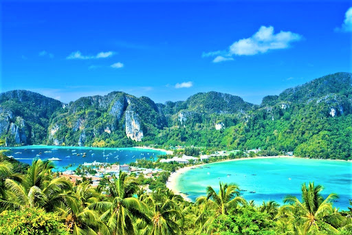Phi Phi Island, just off Krabi on the west Thailand coast, though small, is a very beautiful island. It has a rather rocky mountainous area on the northern half and a hilly area on the southern half. The center is narrow but has the boat harbor on one side and a beautiful beach on the other side. In between is the town, which is a labyrinth of narrow streets full of shops, restaurants, and bars. It can be difficult and confusing at first trying to make your way from the harbor to the beach. From Phi Phi you can take various boat tours to beautiful rocky islands with hidden bays (which can be so crowded with tourists that enjoyment is lost) or other places. We opted for a boat trip to Monkey Beach, which is actually on the northern mountain area of Phi Phi, but only accessible by boat. The boats stop on the beach and monkeys decent from the mountains to ask for treats. If you throw food in the water, they will swim out to get it, or climb up on your boat to ask for more. It's interesting to see the monkeys swim. After that, we went on a nearby snorkeling tour. There were many beautiful fish to see. There are various places to stay, from moderate to expensive, so check the discount travel companies, like Agoda, to see photos, location, and prices. Don't miss this lovely island before the seas rise and the...