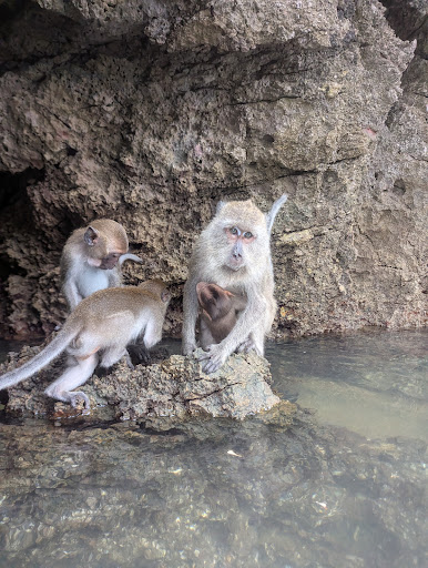 Our guide, Sing, started calling out and a load of monkeys came out of the vines climbing the cliffs to greet him! He fed the monkeys some pineapple scraps and we all hopped off the boat and got to feed them too! They weren't aggressive at all and didn't try to take anything that wasn't held out and offered to them.