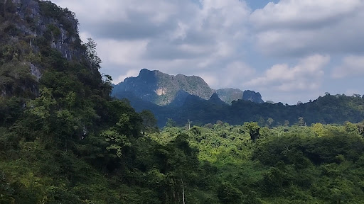 This is a neat park a few kilometers from our home in Muang Loei. It is situated in a crater-like depression in the surrounding hills (you have to climb steps up one side of the rim and descend the other side, down into the park). There is a concrete pathway that crosses the park nearly all of the way with unpaved paths for several hundred meters to access a right nice cave and an area for viewing the land bridge on the north eastern rim of the park. Something to note about this location is that in 2023, during a scientific field survey, a new species of giant pill millipede (25-30mm), Sphaerobelum turcosa, was discovered here. So keep your eyes peeled for this special creature, especially during rainy season. There is ample parking next to Wat Tham Pha Lom and a guest registry. There is about a 50-60 meter elevation change in the initial up/down section of the hike with nice concrete steps...