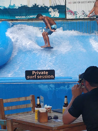 Passed by for a drink and stayed for a surf session, zero experience. Sessions start every hour with a maximum of 7 surfers, turn based. Helpful crew, they try their best to guide you with hand and body signals. There's a photographer on site when I went, you can choose to purchase your photos from him if you want. If you don't want your photos taken maybe you should let him know beforehand. Friendly service staff, there are also promotions for drinks.