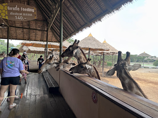 A fascinating experience at Safari World Bangkok is feeding the giraffes. After taking the safari ride into the wildlife area, I reached this special spot. To feed the giraffes, you need to purchase food bags—I don't recall the exact price, around 100 baht I think. Then, you get to hand-feed the giraffes. Usually, a few of them gather at once, making the food bags disappear in no time. If you're into it, buying a couple of food bags is a good idea; otherwise, you can just stand, admire, and continue exploring...