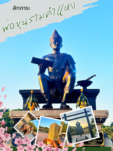Read moreพระบรมราชานุสาวรีย์พ่อขุนรามคำแหง ตั้งอยู่ใกล้วัดใหม่ สร้างขึ้นเมื่อปี พ.ศ. 2518 เพื่อเป็นการเทิดพระเกียรติแด่พระองค์ ซึ่งมีพระปรีชาสามารถ และปกครองแผ่นดินโดยธรรม โดยองค์พระบรมราชานุสาวรีย์ประทับนั่งห้อยพระบาทบนพระแท่นมนังศิลาบาตร ขนาดเท่าพระแท่นจริง พระหัตถ์ขวาทรงถือสมุดไทยอันหมายถึงสรรพวิทยาการต่าง ๆ ที่พระองค์ทรงรอบรู้ พระหัตถ์ซ้ายแสดงลักษณะทรงสั่งสอนพสกนิกรหรือขณะออกว่าราชการ พระแท่นด้านซ้ายมีพานวางพระขรรค์ไว้ข้าง ๆ ขนาดพระบรมรูป 2 เท่าพระองค์จริง หล่อด้วยโลหะทองเหลืองผสมทองแดงรมดำ ลักษณะพระพักตร์อย่างพระพุทธรูปสมัยสุโขทัยตอนต้น ถ่ายทอดความรู้สึกที่แสดงว่าพ่อขุนรามคำแหงมหาราชทรงมีน้ำพระทัยเมตตากรุณา ยุติธรรม และเฉียบขาด เครื่องฉลองพระองค์และศิราภรณ์ยึดถือลักษณะจากเทวรูปของศิลปสมัยสุโขทัย ผู้ปั้นหุ่นพระบรมรูปพ่อขุนรามคำแหงมหาราช คือ นายสนั่น ศิลากรณ์ นายช่างเอกของกรมศิลปากรซึ่งได้รับยกย่องว่าเป็นผู้มีฝีมือเป็นเยี่ยมและเป็นศิษย์ของศาสตราจารย์ศิลป พีระศรี ผู้ก่อตั้งมหาวิทยาลัยศิลปากร ทรวดทรงแท่นฐานอยู่ในผังสี่เหลี่ยมจัตุรัส ลักษณะสถาปัตยกรรมเลียนแบบศิลปกรรมสมัยสุโขทัย เป็นแท่นฐานแบบเจดีย์ทรงกลมในวัดมหาธาตุ จังหวัดสุโขทัย รอบฐานแบ่งออกเป็น 3 ชั้น ชั้นล่างสัณฐานเตี้ยเหมือนมูลดิน ประดับด้วยลวดลายกาบบัว ด้านหน้าประดิษฐานรูปศิลาจารึกจำลองขนาด 2 เท่าของศิลาจารึกจริง ฝั่งซ้ายมือก่อนถึงพระบรมราชานุสาวรีย์...