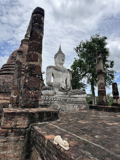 In front of the main chedi is the viharn or assembly hall, of which the base and rows of pillars remain. Seated on a pedestal to the back of the viharn is a large stuccoed stone image of the Buddha in the Bhumisparsha mudra, also known as “calling the Earth to witness” or...