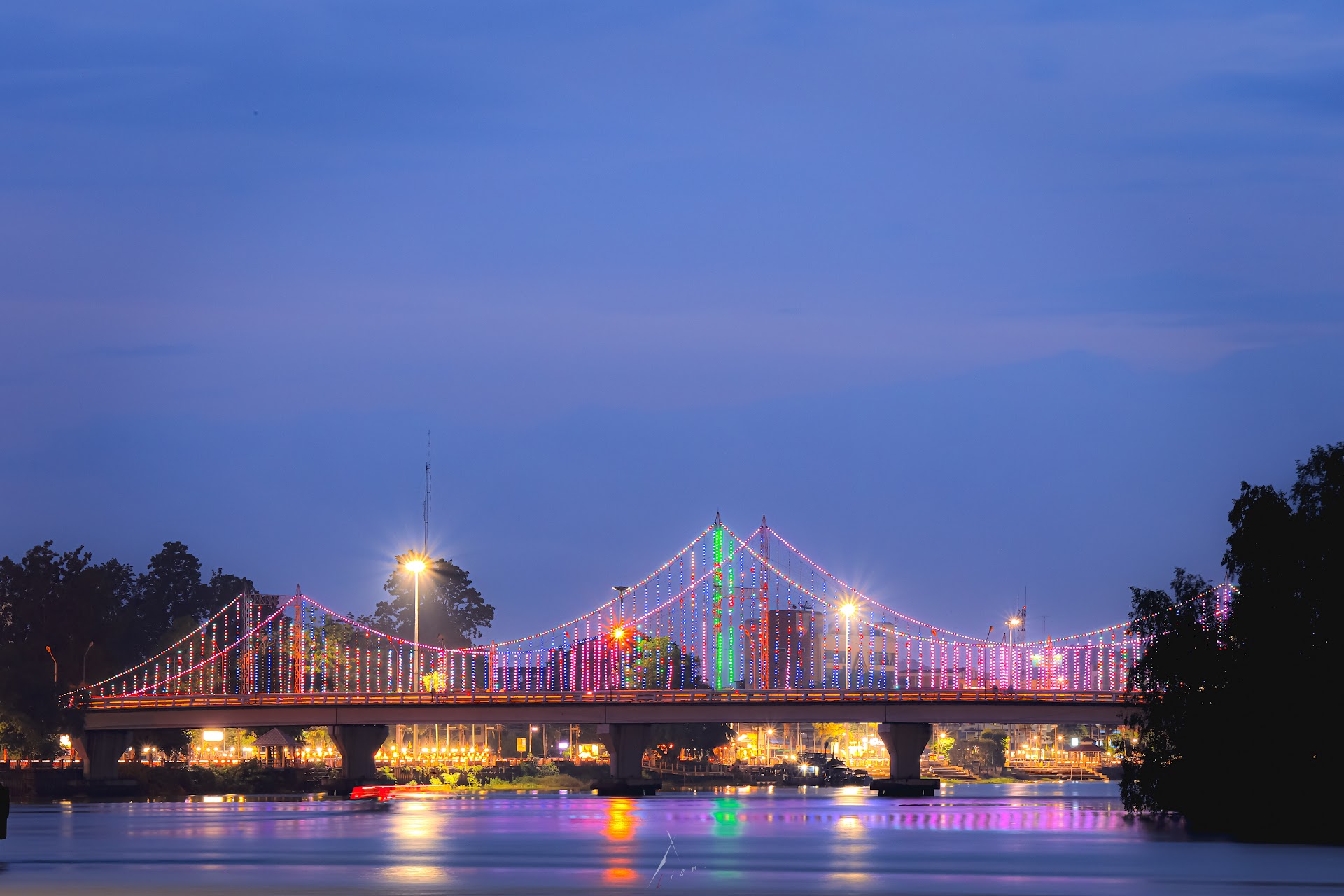 สะพานที่ข้ามแม่น้ำตาปี ของ จ.สุราษฏ์ธานี ที่จะประดับไฟสวยงามตลอดทั้งปี เป็นสะพานที่มี 2 เลน สวนกัน รถยนต์สามารถขับข้ามไปได้ การจราจรค่อนข้างคับคั่งอาจจะถึงขั้นวุ่นวายได้ในบางครั้ง 😆