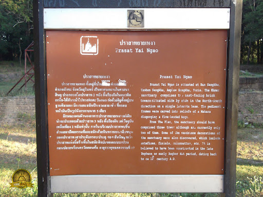 Prasat Yai Ngao is situated at Baan Poonsai , Tambon Baanchob , Amphoe Sangkha , Surin , Thailand. The Khmer sanctuary comprises east-facing brick towers situated side by side in the North-South direction on a single laterite base. The pediment frames were carved into reliefs of a Makara disgorging a five-headed Naga.