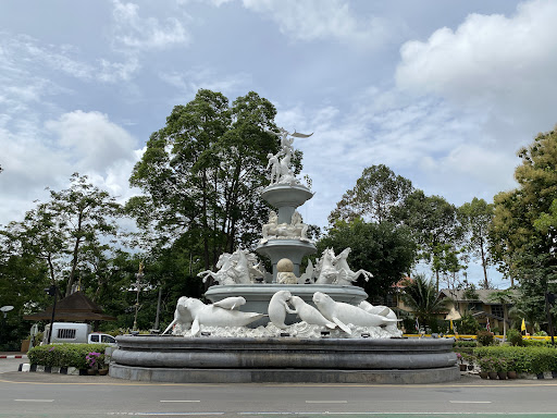 In the heart of Trang city, a unique landmark draws the eye â the Dugong Roundabout. This captivating sculpture of three bronze dugongs leaping upward captures not only the grace of these gentle sea creatures but also the spirit of the Andaman coast. With coral motifs, delicate fin details, and small sculpted fish, the monument pays tribute to Trangâs marine richness. But the real magic begins at night. As dusk falls, the monument lights up with shifting hues of blue, green, and soft gold, thanks to the carefully installed LED system. The dugongs seem to swim through an ocean of light, while the surrounding fountains reflect every glow in shimmering waves. Itâs a scene both dreamlike and photogenic â a favorite among locals and travelers alike. Encircling the roundabout are shady trees and charming cafÃĐs where visitors can enjoy Trangâs famous roast pork or sip coffee with dim sum in the morning. In the evening, the atmosphere becomes lively with people strolling, cycling, or capturing night shots of the monument. The Dugong Roundabout is not just a traffic circle. Itâs a living story about Trangâs coastal heritage, conservation awareness, and love for its sea cows. It welcomes you by day and dazzles you by night â an unforgettable symbol of the city.
