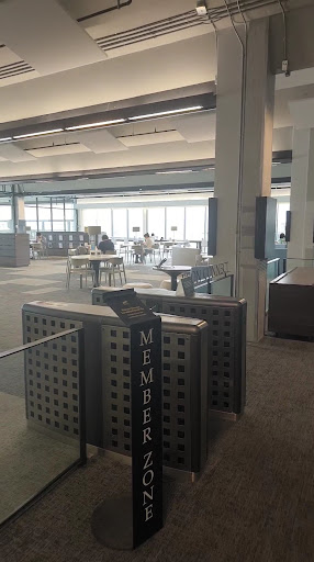 Free entry library with spacious space, a nice atmosphere, and many seats. The seating areas are very quiet. No food is allowed, only water bottles with caps are permitted. It has free Wi-Fi that can be requested from the counter outside the library. Your name and ID number are required. Wi-Fi is available for 2 hours per coupon, but you can ask for more than one. The staff is friendly and very helpful. The parking lot is a bit dim, but there are plenty of spots. It would be nice if they had more charging spots near the desk area.