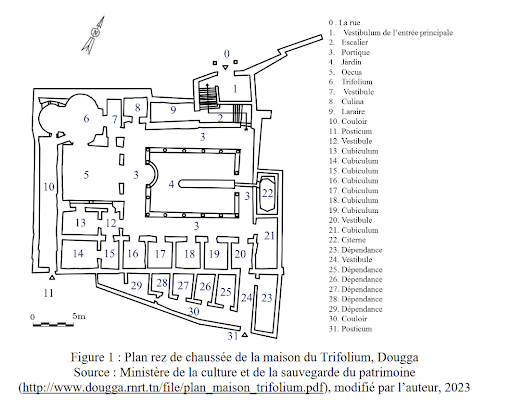 The trifolium villa, named after a clover-shaped room that was without a doubt used as a triclinium, is the largest private house excavated so far at Dougga. The house had two storeys, but there is almost nothing left of the upper storey. It stands in the south of the city, halfway up the hill. The house is particularly interesting because of the way in which it is built to align with the lay of the land; the entrance hall slopes down to a courtyard around which the various rooms were...