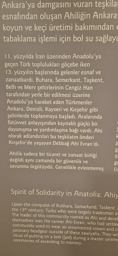 Read moreKüçük bir müze, ama dolu dolu, fikirler şiirler ve ahilik geleneği ile diğer gelenek ve göreneklerden resim ve bilgiler sergilenmektedir. Ankara ile ilgili çok değerli metinler, özellikle tiftik keçisinin yurt dışına kaçırılması ve yününün ticaretiyle ilgili bilgiler ile eski Ankara fotoğrafları var.