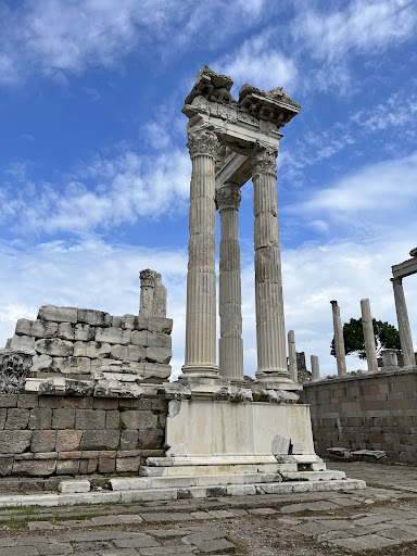 Read moreTapınak MS. 125 yılında imparator Hadrianus tarafından, bir önceki imparator Trianaus adına yaptırılmıştır. İçindeki iki imparatorun heykellerinin büstleri Berlin Müzesi’nde sergilenmektedir. Tapınak Akropolün en yüksek noktasına, 68 mX58 m boyutlarında, sonradan düzenlenen bir teras üzerine kurulmuştur. Terası tepenin eğimine düzlemek adına tonozlar ve kemerler ile zemin düz hale getirilmiştir. Tapınağın avlusunun zamanında heykellerle süslü olduğu kazıda çıkan yazıtlardan anlaşılmaktadır. Sütun başları korint düzende yapılmış olup gövde düz yivlidir. Alında ve frizlerde dönemin el işçiliğinin muazzam örneklerini görmek...