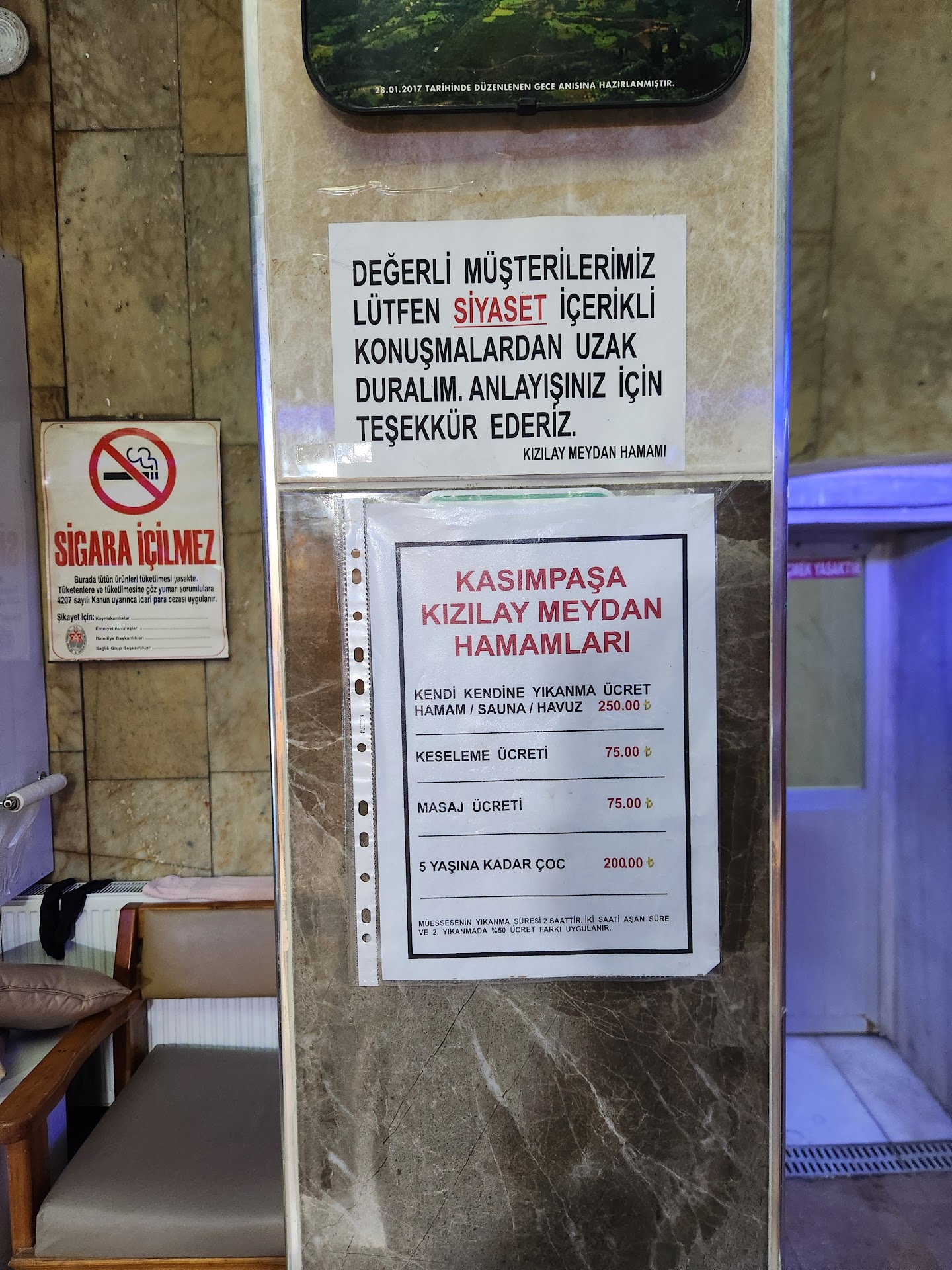 The lady dont speak English but you can communicate easily without problem. I paid total of 450lira for bath, scrub and soap massage. (Price on 26/8/2024) The lady will give you a room key and you can keep your personal belongings inside the room which is safe. The place is not fancy decorated but overall is clean.
