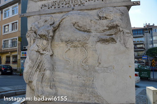 The Column of Marcian (Turkish: Kıztaşı) is a Roman honorific column erected in Constantinople by the praefectus urbi Tatianus (450-c.452)[1] and dedicated to the Emperor Marcian (450-57). It is located in the present-day Fatih district of Istanbul. The column is not documented in any late Roman or Byzantine source and its history has to be inferred from its location, style and dedicatory inscription. The column is carved from red-grey Egyptian granite, in two sections. The quadrilateral basis is encased by four slabs of white marble. Three faces are decorated with IX monograms within medallions, and the fourth with two genii supporting a globe. The column is topped by a Corinthian capital, decorated with aquilae. The inscription confirms that the capital was originally surmounted by a statue of Marcian, in continuation of an imperial architectural tradition initiated by the Column of Trajan and the Column of Marcus Aurelius in Rome. The basis of the column is orientated northwest/southeast, while its capital is aligned north/south, possibly so that the statue could look towards the nearby Church of the Holy Apostles #columnofmarcian #marcian #romanempire #roman