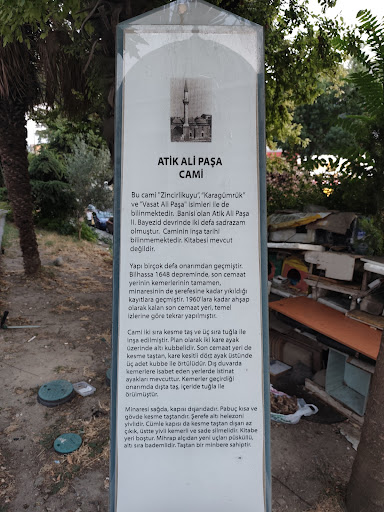 Türkçe : ATIK ALÍ PAŞA CAMi Bu cami "Zincirlikuyu","Karagümrük" ve"Vasat Ali Paşa" isimleri ile de bilinmektedir. Banisi olan Atik Ali Paşa II. Bayezid devrinde iki defa sadrazam olmuştur. Caminin inşa tarihi bilinmemektedir. Kitabesi mevcut değildir. Yapi birçok defa onarımdan geçmiştir Bilhassa 1648 depreminde, son cemaat yerinin kemerlerinin tamamen, minaresinin de şerefesine kadar yıkıldığı kayıtlara geçmiştir. 1960'lara kadar ahşap olarak kalan son cemaat yeri, temel izlerine göre tekrar yapılmıştır. Cami iki sira Kesme taş ve üç sıra tuğla ile inşa edilmiştir . Plan olarak iki kare ayak üzerinde alti kubbelidir. Son cemaat yeri de kesme taştan, kare kesitli dört ayak üstünde üç adet kubbe ile örtülüdür. Diş duvarda kemerlere isabet eden yerlerde istinat ayakları mevcuttur. Kemerler geçirdiği onarimda dışta taş, içeride tuğla ile örülmüştür. Minaresi sağda , Kapısı dışarıdadır. Pabuç kısa ve gövde kesme taştandır. Şerefe altı helezoni yivlidir. Cümle Kapısı da kesme taştan dışarı az çıkık , üstte yivli kemerli ve sade silmelidir. Kitabe yeri boştur . Mihrap alçıdan yeni uçları püsküllü ,altı sıra bademlidir. Taştan bir minbere sahiptir. العربية : مسجد عتيق علي باشا يُعرف هذا المسجد أيضًا بأسماء "زنجيرلي كويو" و"كاراغومروك" و"واسات علي باشا". شغل مؤسسه، عتيق علي باشا، منصب الصدر الأعظم مرتين في عهد بايزيد الثاني. تاريخ بناء المسجد غير معروف، ولا يوجد عليه أي نقش. خضع المبنى لعمليات ترميم عديدة. وتشير السجلات إلى أن أقواس النارتكس، بما في ذلك المئذنة وصولًا إلى شرفتها، قد دُمرت بالكامل في زلزال عام ١٦٤٨. أُعيد بناء النارتكس، الذي ظل خشبيًا حتى ستينيات القرن العشرين، بناءً على آثار أساساته.
