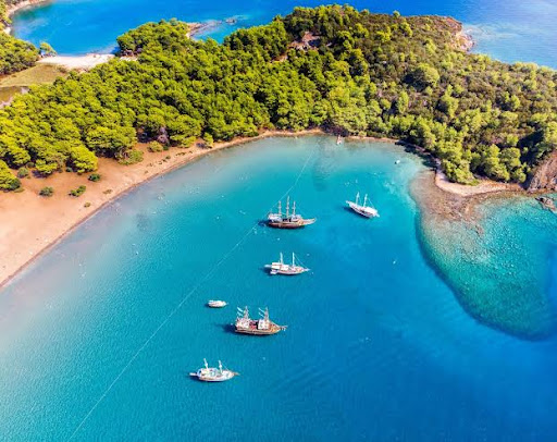 Koy kısmı ise cabası. İnce kum ya da küçük çakıllı sahil, sığ ve sakin deniz — çocukla gelenler için ideal. Denize girdiğiniz anda suyun berraklığı, balıkların görünürlüğü ve doğanın sessizliği insanı dinlendiriyor. Sabah erken saatlerde güneşin denizi ve antik taşları aydınlatışı, öğleden sonrasının gölgelerle oyunlar oynaması büyülü.