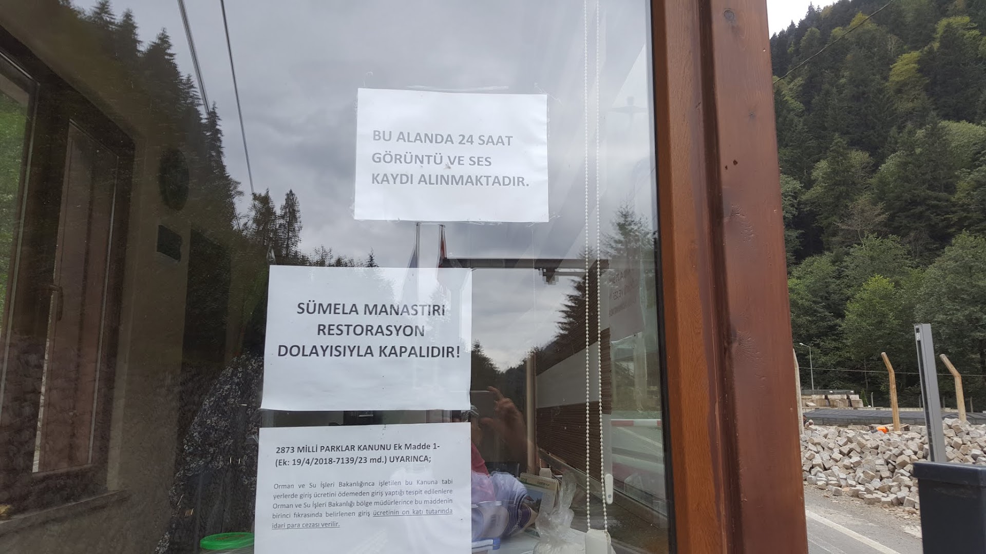 Sümene manastırını ziyaret etmek için milli parkın kontrol noktasından giriş yaptık. Ücreti sorduk. 11 TL. dediler ödedik ve içeri girdik. O kadar daha yol gittikten sonra manastırı gezmek için yaklaştığımızda restorasyon görevlileri " Hooppp durun hemşehrim. Tadilat var. Giremezsiniz. Dönün geriye... dediler. Ama biz parasını ödedik dedikse de bizi ilgilendirmez dediler. Kontrol noktasına geri döndük. Kontrol noktasının pencere camlarına dikkatlice baktığımızda bir a4 fotokopi kağıdı büyüklüğünde ilan yapıştırmışlar. tadilat var diye. Paramızı geri istedik vermediler.