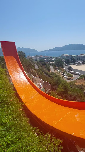 Read moreVisit Wed 21.06.23 Review to balance the mainly paid-for/staff ones below;- To buy advance tickets from ticket apps or parks own Turkish language site, (on-gate price shown as 500lira & 480 advance) is impossible & gives dates from 1st July onwds, when transfer bus services available, (10 days after planned visit.) Frequent dolmus buses use main road along length of town to get you to the bottom of the (steep) waterpark access road, which overlooks Marmaris & entire bay area- view is spectacular from inside, tho can be had without paying to go in...Taxis get you close to the main entrance, -not obvious due to " being moved" according to staff- & wait by park exit along with free minibus service dropping back to hotels. Agree taxi prices in advance. Entry price is actually 600 Turkish lira [ £20-ish currently], a large locker for bags, clothing, valuables etc in changing rooms is 50TL deposit, & a electronic payment card onto which you can preload money to purchase food/drinks in restaurant & separate pool bar area, (& snacks in central waffle/ice cream concession should it be open.) Money not spent by days end is returned in Lira. No other purchase method is used in the park-standard practice in attractions to avoid carrying cash, but be sure not to lose your card when swimming, sliding, or moving around- theres no obvious way of determining ownership once card is issued/lost/claimed. Changing rooms next to reception are decent size, (slightly dim inside), with functional toilet & shower facilities as well as the lockers. Numbered locker key tags are worn using the elasticated wrist bands. Access to swimming, slide, & sunbed areas is via steps up to next "floor" level. Should be a lift for wheelchairs & prams tho I don't recall seeing one. Exiting roofed stairs into park, walking surface is combination of (slightly rough) concrete, and clay tiles with light soft landscaping & few big trees, incl on long shared flight of poorly-maintained steps to top of all slides with smattering of larger artificial grass matting zones directly adjacent swim & slide access points. Beyond the mats, the unshaded materials exposed to direct sunlight become superheated to a level where painful to walk barefoot. Footwear can't be worn on slides (or swimming) so you may have to walk back up the scorching steps to slide entry point to collect your shoes you needed on the steps... Plastic mats on sunbeds also suffer similar issue unless you bring a towel to cover them. Photos online show the current slides, either enclosed or open "straight down drop" type requiring sitting/lying on a single person polyfoam mat, [incl. linked units where up to 4 race together], or open/enclosed (dark inside), which allow travel on (supplied) single or double inflatable rings with grip handles on longer slides with multiple loops & direction changes. The compressor was left near the rings & DJ. The loud, thumping dance music is TOTALLY inappropriate for the vibe! Water gushing down slides means all end with you being whooshed into the constantly-fed catch pools (about 2 ft deep) & to exit via steps with handrail. Rides have information boards, at (top) entry showing min height requirements, how best to enjoy each ride, & staff are located to ensure rules are followed & safety maintained, incl keeping sufficient gap between riders. Staff are attendant 7 days a week during opening from 10am-5pm, though have break 12-12.30 (lunch) & 3-3.30 (mid afternoon when hottest). This can be slightly limit younger users/families not planning their day ahead. Pool sides are rough concrete, poorly painted & maintained & uncomfortable to sit on, but water quality appears good & constantly checked. Some slides were not open due to scaffolding/obvious upgrading work (better done out of season?), & the wave pool & kids water jet "squirt" zone were also out of order for day. Restaurant staff struggled to keep up food deliveries with customer orders in peak lunch period, but quality of pizza & chips/nuggets was good, & drinks were chilled. There's 1 other park...