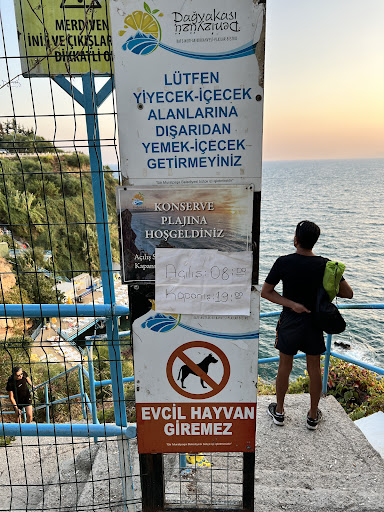 The public "beach" is a small section of the classic Turkish definition of a "beach." What you will find is a small elevated deck off the cliff face with an entrance walkway into the sea. Entering needs to be done carefully due to the rocks, it may be necessary to time entering with the motion of the sea. At this location you may setup a chair you bring with you or lay out a blanket if space allows. The confusion begins at the sign that is located near one of two stairways down. When you walk down roughly a about 100 foot switchback stairs you land at a private beach club at a concession stand and the changing room area. You need to walk to the right passing the sun loungers with umbrellas and showers until you reach a open deck area with no sun loungers just open deck. Directly in front of you will be another switchback stairway not in use. To your left will be a stairway into the sea, beware the rocks. You will know you are not on the public beach because if you try to use the sun loungers someone will come and demand try$ The guy that braced us wanted 130 try per lounger. He clearly pointed out the public area and basically said get out. Then he proceeded on to a young lady from England. You may also have a problem using the showers and changing room. When I was there it was near 7:30pm and the same guy was angry I was in his way and sprayed me with a hose laughing while other employees laugh too. Very friendly, yes. We all have our own experiences...