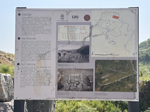 Vedius Gymnasionu’nun güneyinde bulunan stadyum her çeşit törenin, atletik yarışmaların, araba koşularının ve gladyatör dövüşlerinin yapıl dığı yerdi. Güneydeki oturma yerleri Pion, yani bugünkü Panayır Dağı’nın etekleri üzerin de bulunmaktadır. Kuzeydeki oturma yerleri ise tonozlu ayaklar üzerinde inşa edilmiştir. Oturma yerleri Erken Hıristiyanlık Dönemi’nde Ayasuluk surunun yapılmasında kullanıldıkları için stadyum çok tahrip görmüştür. Stadyumun yalnız batı yönü gün ışığına çıkarılmıştır. Yerde duran sütun altlıklarından anlaşıldığına göre, stadyuma bir kemer sırası ile giriliyordu. Ele geçen yazıtlardan stadyumun imparator Neron (M.S. 54-68) zamanında inşa edildiği öğrenilmiştir. Girişteki sütun kaidelerinin arasında yer alan ve özensiz bir işçilik gösteren mermer ödül vazoları ile zeytin dalı ve tavşan tasvirli plakalar M.S. 3. ya da 4. yüzyılda stadyumda yapılan değişiklikler sırasındandır. Gladyatör dövüşleri ile hayvan kızdırma eğlenceleri stadyumun doğu ucunda yapılıyordu. Güney tarafı oturma sıraları yamaca oyulmuştur. 200 m uzunluğun da olup 30.000 kişi...