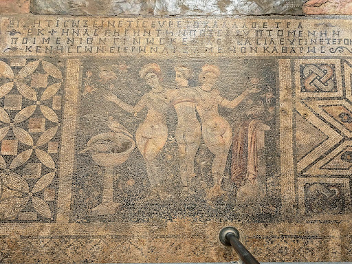 Read moreMosaical bottom of the swimming pool, Roman bath constructed in the IV century A.D. in Narlikuyu. Inscription on mosaical pannel says "My friend, if you wonder who has discovered the hidden source of this wonderful bath water then you should know that he is Poimoneis, who ruled the Holy Islands in justice and was the friend of Emperors". This inscription provides us the name of a man who built this bath Poimoneis. Here, you can see three daughters of Zeus, also known as three graces. Their names were Aglaia, Thalia, and Euphorosine. They were also called Kharides in ancient Greek, which means light because Kharide derives from kharis of light. Narlikuyu, Silifke Municipality, Mersin Province, 🇹🇷 Turkey 🇹🇷....