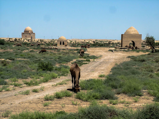 Merv was really impressive for history and past culture lying in the Karakum Desert. Here is the Tomb of Ahmad Sanjar which was built in 1157. Apparently, he fought off several invasions and uprisings until finally being defeated by the Oghuz. After being sacked by the Oghuz, Merv declined and in 1221, the Mongols attacked it and burned down the mausoleum. It would later be restored by Soviet, Turkmen, and Turkish architects during the 20th and 21st centuries. The tomb is part of The State Historical and Cultural Park "Ancient Merv", a UNESCO World Heritage Site. So that is from Wikipedia and gives something of...