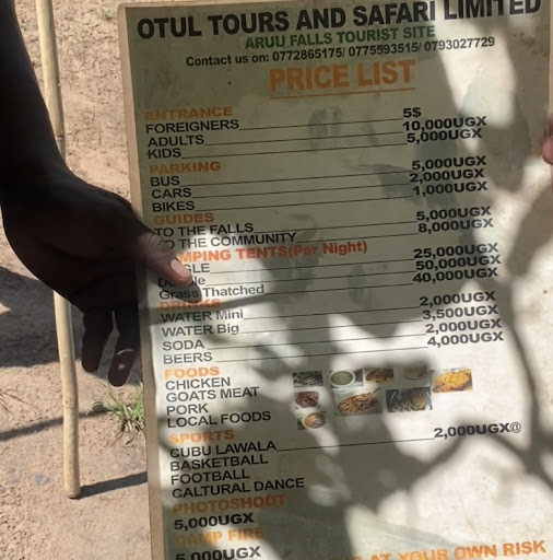 Aruu Falls is located about 50 kilometres on the Gulu Kitgum road. The only option available there now is camping in tents and a picnic arrangement - carry your food and have a cooking/catering plan.