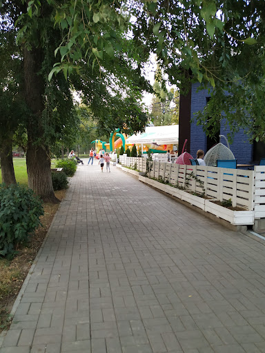 Кто-то скажет, что этот "парк как парк, ничего необычного". Но, учитывая то, что в городке и ближних сёлах вообще ничего нету, то он очень даже ничего. Аллеи выложены плиткой, зелёные фигуры животных, мультипликационных героев ( Шрек, Мики и Мини Маус, Губка Боб) детская горка, карусель, канатные развлечения, качель для инклюзивных деток ( что очень важно!), фонтан( работает), качели - гойдалки и обычные лавочки, красивые цветочные композиции ( петунии и другие). Производится полив травки. Есть туалет. Есть возможность перекусить. Присутствует столики под навесом и невеликий выбор еды ( шаурма, пицца, картошка фри, гамбургер), холодная вода и напитки, мороженое, десерты, кофе. Отдельно продают попкорн, платная детская комнатка двухъярусная и детские машинки на пульте. Детский паровозик по территории. На территории есть деревья!!! Что очень важно в летом в жару, и соответственно есть тенек. Гуляется и дышится нормально. (Ведь в городе есть неплохая площадка для деток, но она вся на солнце и рядом ни дерева, чтоб создавать тенек. Долго не понимаешь, или вообще не поиграешь). Не понравилось, что машинки стоят прям вблизи возле площадки. Были бы уже все платные развлечения в одной зоне, а не разбросаны...