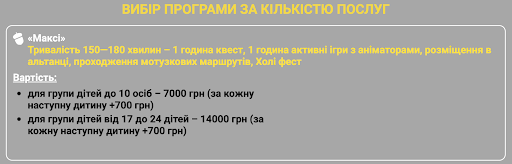 Read moreВважаю, що програма днів народжень сильно переоцінена. По перше, на сайті до сих пір ціна за максі день народження становить 7000 грн, в якій прописано, що буде декілька мотузкових маршрутів надаватися до програми. По факту, по телефону ціна 9500 грн, і якщо у вас 9 дітей (хоча програма розрахована до 10 дітей включно), то мотузковий маршрут тільки один, всі інші доплачуються. Дууууже сумна програма аніматорів, яка виходить становить більше 5000 грн, по часу займає 1,5 години максимум. Після цього батьки самі контролюють кожну дитину (нас про це не попереджали, і ми мусили вдвох на др сина контролювати одночасно 9 дітей), інструкторів чекали і просили інструктаж перед трасами, особливо ніхто не контролював по безпеці. Максимально не клієнторієнтована власниця, непривітна як по телефону, так і в самому парку. Плюси – чудова природа, але багато комарів, про яких теж забули попередити і попіклуватися про відвідувачів. Нема смітників на бесідках. Порада: спортивний варіант для проходження трас – можливо, але є питання по безпеці. Комплексна програма проведення днів народжень – категоричне ні!! Рекомендую знаходити компроміси з відвідувачами та гостями, оновити цінову інформацію на сайті, щоб не вводити людей в оману та зрозуміти, що бізнеси мусять працювати для...