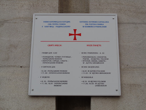 Read moreВважається, що на місці катедри існував дерев'яний костел, який збудували близько 1370 року литовські князі Корiатовичi. Вже через п'ять років на прохання польського короля Папа Григорiй XI засновує в Кам'янці дiєцезiю i костьол стає катедральним. Першим біскупом, як вважають, був домініканець Вільгельм. Будівництво кам'яного костелу пов'язують з біскупом Якубом Бучацьким (1502-1517), котрий був людиною набожною та заможною, виділяв також кошти на укріплення Кам'янецького замку. Спочатку костел був в романському стилі, відрізнявся простотою форм та мав три нави. В той час вівтар був орієнтований на захід i знаходився там, де зараз вхід до храму. До середини XVII ст. костел сформувався як тринавова, з довгим пресбітерієм, кількома ренесансними каплицями та високим притвором споруда, західний фронтон якої був вирішений у формах маньєризму. У XVIII-XIX столітті костьол реконструюється у стилі бароко і псевдоготики. Під час ремонту 1853 - 1862 рр. художник Д.Сампіні, за участю львівського художника М.Яблонського, виконав темперні фрески на стінах південної каплиці. Тоді ж з’явилися вітражі з богемського скла, підлога з теребовлянського пісковику та карарського мармуру, встановлено новий 20-регістровий орган роботи віденського майстра Гессе Найцікавіше у костелі знаходиться у каплиці Непорочного Зачаття Пресвятої Богородиці. Це - надгробок Лаури Пшездецької авторства скульптора Віктора Бродзького. Первісно його було встановлено на могилі Лаури Пшездецької в костелі Успіння Пресвятої Діви Марії в Чорному, що у віці 21 року впала з коня і померла. У 1938 році надгробок перенесли до кам'янецької катедри. Скульптурна композиція складається з ложа, на якому лежить подоба дівчини Лаури. У підніжжі монумента — розкрита книга; ліворуч ложа стоїть амур, що спостерігає сон панни. Зліва і справа від ложа на обніжжі встановлено бюсти батьків Лаури — Софії і Карла Пшездецьких. На надгробку вміщено напис: «Дівиця Лаура. Згасла в розквіті літ. Її прекрасне обличчя є...