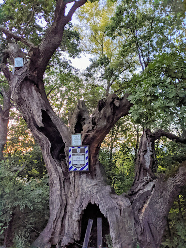 Дубу 900 лет, зелёные только пару веток, дуб горел, корень полностью выгнил до большого дупла, одну ветку подпирали, но она все равно упала, часть кроны заливали бетоном. На другой ветке крестики, сверху - икона. Но дуб стоит, крепкий еще,...