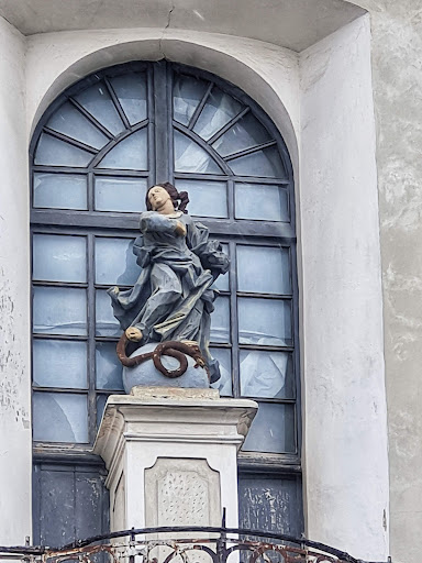 Центральною скульптурою фасаду є постать Богородиці, яка стоїть на земній кулі і бореться з агресивним змієм :права нога Пресвятої Діви відкидає змію убік, а ліва притискає її голову до землі. Ще скульптури апостолів Петра і Павла і невідомих святих.