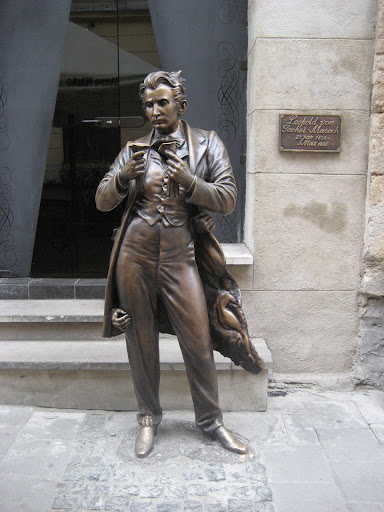 У історичному центрі Львова біля входу в ресторацію “Мазох- кафе” (рекомендуємо: дітей туди не водити!). В 2008 році з’явився пам’ятник Леопольду Мазоху (скульптура львів’янина Володимира Цісика). Високий, статний, у повний весь свій зріст – 170 см, латунний Леопольд Фон Захер-Мазох вдягнутий за тодішньою модою в крислаті штани, вільну блузу, жилетку та розлогий сюртук. Обличчя задумливе, зосереджений погляд звернений донизу. Здавалося б: нічого особливо і провокативного, та ба! Протерта права кишеня штанів молодого Леопольда вказує на те, що там неодноразово побували чиїсь руки. Спробувавши і собі дослідити кишеню скульптури, Ви там на диво не знайдете рукописів, дамського носовичка чи записника, а от “доказ статі” потрапить у вашу долоню (чомусь, за задумом скульптора, Леопольду було не до вподоби носити спідню білизну!). Та це ще далеко не вся інтимна інтерактивність! Якщо постаменту Леопольда Мазоха так і не вдалося Вас засоромити, то наступна “родзинка” його латунної особистості однозначно знітить навіть найбезсоромнішого Дон Жуана: досягнувши до грудей пам’ятника Ви побачите невеличку дірку, а зазирнувши через неї всередину перед Вами відкриються картинки-зображення любовних ігор. Також неможливо не помітити, що з під подолу плаща Мазоха простягаються кисті рук. За задумом, як стверджував сам скульптор, ці руки, які, до речі, є жіночими, означають його пристрасть до жіночих грубощів. Та й сама “діра з секретом” на грудній клітці скульптури Леопольда є також досить символічною. Як відомо, Леопольд фон Захер-Мазох мав оказію опинитися у спальній кімнаті своєї тітки і підглядати за їхніми з коханцем чи чоловіком любощами, за що й був відлупцьований. Таким чином у скульптурі відображені всі пороки молодого...