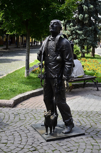 Пам'ятник «останньому чарівникові в Мукачево» Цей трохи казковий персонаж з'явився на головній площі Мукачево в 2010 р і дуже скоро став символом міста. Бронзовий сажотрус замріяно дивиться вгору, а біля його ніг так само дивиться вгору милий кіт-воркот. Розгляньте Щасливого Сажотруса уважно: у нього є весь інвентар, необхідний для чистки димоходів: гиря, щітка, ключі від горища та залізні дроти. Місцеві жартують, що для повної схожості пам'ятника не вистачає тільки велосипеда, на якому всі звикли бачити чоловіка - реального прототипу скульптури.