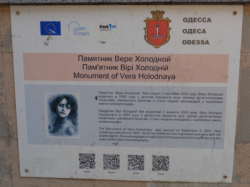 Рядом с Соборной площадью, на оживленном месте Преображенской стоит памятник красивой женщине в шляпке, так настоящие любители кино чтят память первой кинозвезды Веры Холодной, королевы немого синематографа.Памятник Вере Холодной был открыт 2 сентября 2003 года (скульптор - Александр Токарев). У ног актрисы изображены цветы и обрывок кинопленки с надписью "Одесситы - звезде немого кино". Из пятидесяти фильмов, в которых она успела сняться, сохранилось...