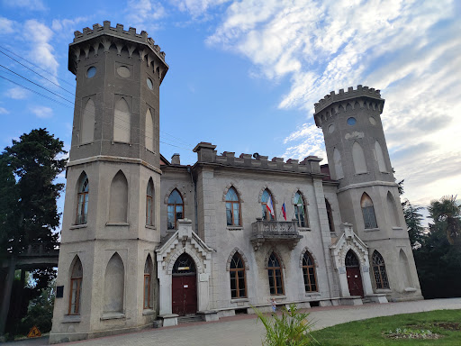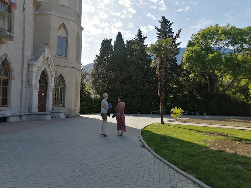 Очень красивое строение. Не дворец в классическом понимании, но этакий небольшой, но внушитеьный каменный дом в смеси готического и мавританского (как мне показалось) стилей. К сожалению, в аварийном состоянии и не эксплуатируется. Левая часть, срединенная аркой с основным зданием (вроде бы церковь) также не в хорошем состоянии. Фасад здания, обращённый к морю (лестницы) частично разрушен (перекрытия над лестницами. Но основная, лицевая часть, выглядит великолепно и очень фотогенична. Круговая площадь перед зданием - уютное и днём всегда людное место отдыха, прогулок и игр с детьми. На деревьях вокруг резвятся белки. Сад великолепен, но за пределами круга перед "дворцом" неухожен. От "дворца" отлично видна гора Ай-Петри. На спуске к морю есть старый заброшенный детский фонтан "Сказки Пушкина", находящийся в ужасном состоянии, заброшенный и поломанный. Видимо, поэтому он отсутствует на карте санатория на въезде. Очень жалко! Он архитектурно выглядел, думаю, впечатляюще, и создавал атмосферу прохлады, уюта и детства. Если бы его восстановить, добавил бы этому месту баллов вне всякого сомнения. 4 балла за неухоженность, наличие баков с мусором непосредственно возле площади, вечерние тусовки...