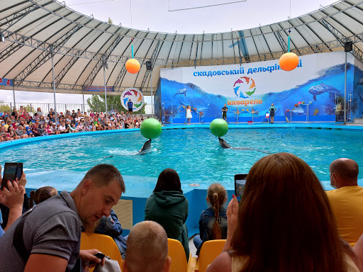 Read moreДельфінарій знаходиться на окраїні Скадовська. Для авто передбачена парковка, але місць всім не вистачає, тому паркуватися водіям доводиться обабіч дороги. Територія досить велика, але жодному кафе місця тут не знайшлося. Лише попкорн, напої і сувеніри. А ще розваги, як то стрілецький тир, батут, тераріум і перевернутий будинок. Доречність цих об'єктів під питанням, уваги вони не варті. Саме шоу з дельфінами і морськими котиками проводиться двічі на день: 11:00 і 18:00. Щоб на нього потрапити варто приїжджати раніше, особливо у вихідні дні. Так і місце собі обрати можна. Сидячи у першому ряду будь якого сектору, можна легко намокнути)) На мою думку - оптимально - це 2 і 3 ряд. Сектор, в принципі, не так важливо - з усіх ракурсів добре видно, що відбувається на сцені. Саме шоу дійсно захопливе. Дельфіни, морські котики та інструктора просто молодці. Художній супровід ведучої і клоуна не дуже нав'язливий, споглядається органічно. Фішка з аукціоном на картину, намальовану дельфіном - на любителя. Загалом - чудове шоу, діти у захваті, та і дорослі також)) за окремим планом і за великі гроші, можлива реабілітація через спілкування...