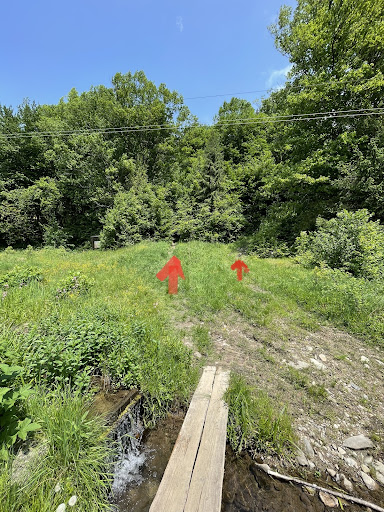 «Дякую» коментарям нижче, блукали 1годину по лісі в невідомому напрямку!(наверху зустріли пару яка так само блукала) Підйом знаходиться одразу біля знаку з хрестом(по тій стороні), крайня хата зправа. Її потрібно обійти, і через потічок НІКУДИ не йти далі, одразу є 2 підйоми які зʼєднуються. Позначила на фото стрілочками) Щоб точно не загубитися, початок підйому позначений камінцями та табличкою(фото)