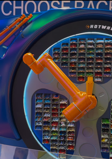 What a conceptāpretty amazing, actually. My son is obsessed with Hot Wheels, so of course we had to try it. Thereās a robot that hands you three cars you choose from a screen, which is pretty cool. After that, you head into a giant play area.