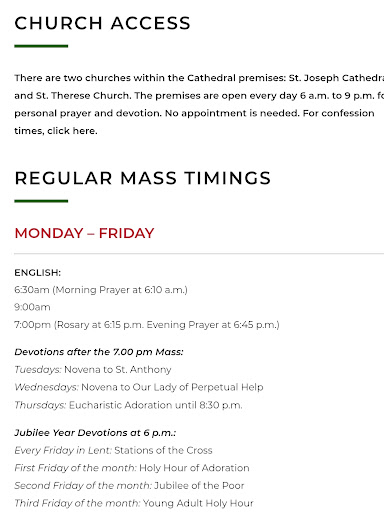 6:25 a.m. to 6:50 a.m. (St. Joseph) 8:45 a.m. to 9:30 a.m. (St. Therese) 4:15 p.m. to 5:00 p.m. (St. Therese) 6:45 p.m. to 7:30 p.m. (St. Therese)