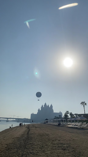 Aquaventure beach located in Persian Gulf is such a really good place to enjoy yourself, relax, sleep, see the beautiful view, at your back is Atlantis Hotel with hot balloon