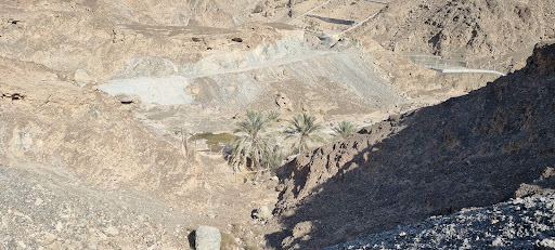 The train is well marked with cairns and some arrow marks at some points. At 6.2 km, the wadi is going to the right side but you have to deviate from it and go straight up instead (25.555580, 56.156951). After walking about 700m, you pass a beautiful small lake formed by a dam with trees coming out of the water. Walk over the dam (25.553033, 56.159257) and go down. You will see some stairs. This road will lead you to the starting point. There are some sulfur pools also towards the end of the trail. Many people come by car at the bride point to take a picture (25.541830, 56.160513).