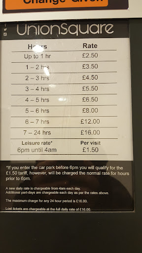 Read moreShopping Centre with Car Parking. Most of the shops are situated INDOORS, with just a few being OUTSIDE. The Centre has its OWN Car Park directly adjoining the actual centre. Although MOST parking spaces are undercover in a Multi Storey facility, there are also a number of parking spaces in the Street level OPEN AIR car park situated at the vehicle entrance. There is a HUGE range of High Street Shops & Restaurants, along with a multi screen Cinema too. Most of the Shops are open until 9pm or 10pm-varying by individual Shop. Most Resraurants open til LATE 7 days a week. Car Park charges vary GREATLY depending the TIME of Day & DAY of Week. But AFTER 6pm on MOST evenings the charges are minimal. e.g.: approx. £1-£1.20. There are several blocks of Public Toilets, along with a number of Disabled Toilets & also Baby Changing Rooms. All Levels are accessible by 3 different ways-: Lifts, Escalator & Stairs. Car Parks are accessible by Lifts & Stairs. Prices for Car Parking are detailed in photo and are correct as...