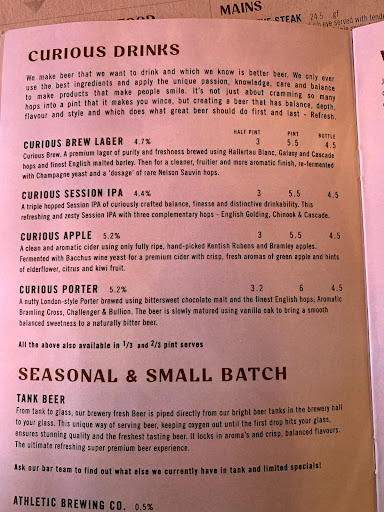 Read moreThe one beer that I actually wanted to try and they were out of it! The staff appear far too often to the point where they are like annoying children. I know it wasn't busy but they kept asking if we were ready to order 3 times in the space of about 7 minutes, not sure what the rush was. Did the kitchen staff want to go home? I'm not a regular so had to read the menu top to bottom to see what I wanted to eat, as you would in any other restaurant. The meal arrived quickly as I'd expect with the eagerness of the staff. When we received the meal, within a minute of the sauces being brought over, another member of staff appeared to ask if everything was alright with it. I had only just received it and hadn't even had a chance to taste it at that point. I'm sure they must be running a tag team in the kitchen as to how to annoy customers. The meal was OK, nicely cooked and filling. I'm not sure the reused Wilkins jam pots are a good idea for serving sauces in though as the label had left a sticky residue on it and so I had to hold it with a napkin. A pretty gross feeling to be honest. With all the constant bothering by staff I couldn't relax and felt really rushed. On top of that I couldn't figure out the old collection of record sleeves on display. Almost all of them would be for fans that are now in their 60s and 70s. What type of person are you trying to attract with that? Doesn't seem to even fit with it being a brewery but then I'm not an interior designer or run a brewery so what do I know. Needless to say we were only there for about 45 minutes and left to find somewhere nicer that we would be left alone by staff to enjoy ourselves and our drinks. Is this place worth a visit? Probably yes, if you're in the area. Would I return? Not...