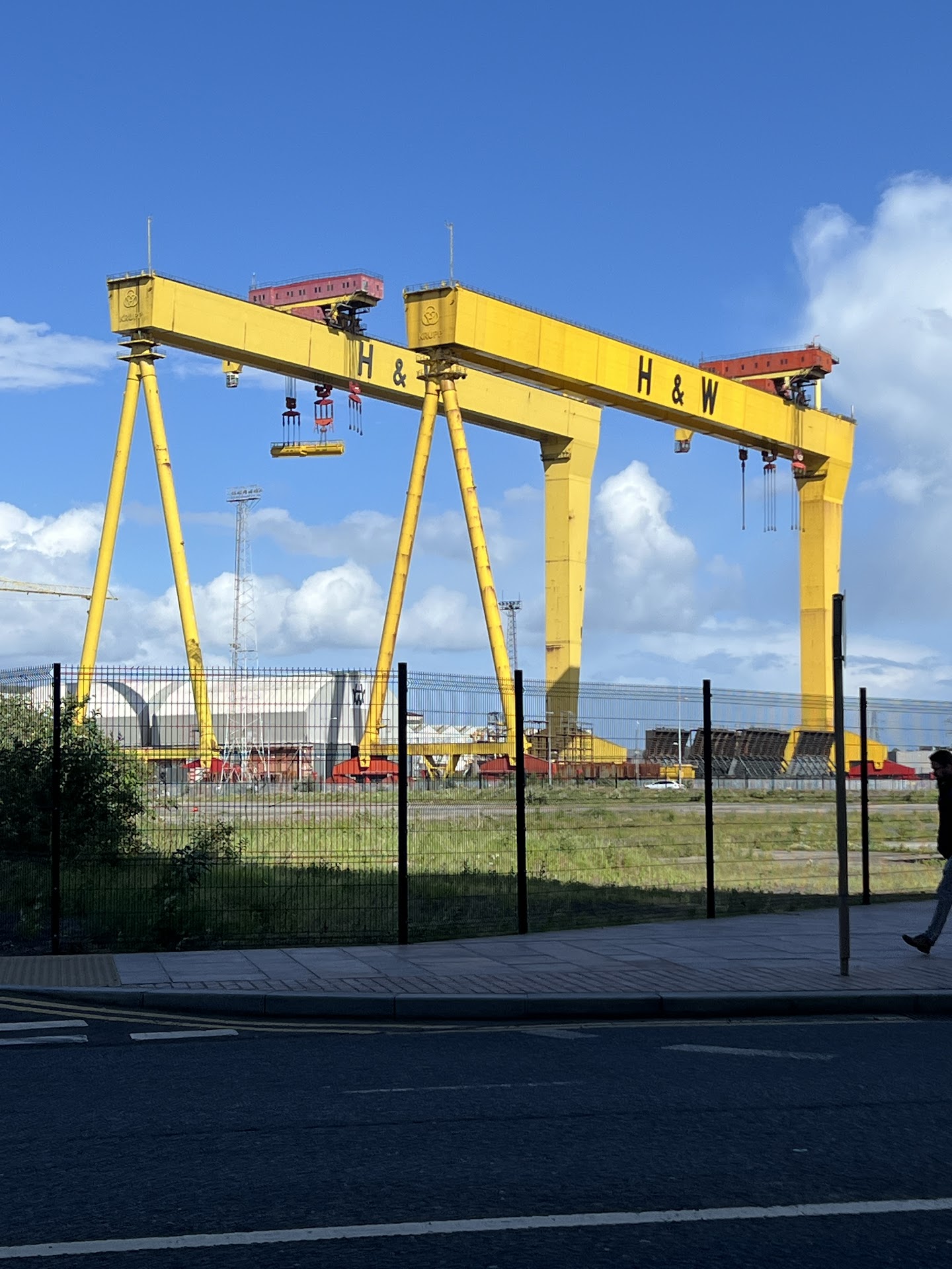 Seeing these gantries that dominate the city skyline up close allows you to appreciate their sheer scale and discern details missed from a distance. The patches of rust interrupting the vibrant yellow, the geometric Krupp logo on Goliath's end, the high windows in the red boxes that sit on top of both. These cranes are ever present in the consciousness of the citizens of Belfast, a constant steadfast feature, instantly recognisable landmarks and symbols of heavy industry so prevalent in the city's past. By night, the glow of red lights at their highest points provide illumination for planes landing and taking off from the nearby George Best City airport. The cranes do move, though I've never seen this happening....