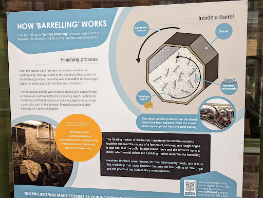 Read moreCoffin Works were established in 1882 by Alfred and Edwin Newman. Originally brass founders, they predominantly made cabinet furniture until 1894, when the company moved to the present site on Fleet Street and began to specialise in the production of coffin furniture, the name given to the plates, handles and decorative object which adorned coffins. They business and ceased trading in 1998 falling victim to cheaper imports and the increase in cremations removing much of the market for the quality coffin furniture they produced. The factory is a time capsule showing beautiful examples of craftsmanship, hand chiseled steel dies used in drop forges to press out the decorations for coffins. Produced on site these are on display they show the progression in design through the history of Newman Brothers. The knowledable volunteer guides use of the equipment to produce the decorations, to stamp the desired parts out. This is a fascinating workshop which shows the light engineering and craftsmanship for which Birmingham was rightly famous. Don't expect a sterile museum, this looks as if the workers have just gone for tea and will be back shortly. Renowned for thier cast brass fittings, used on the coffins of kings and Queens and the rich and famous, the warehouse area allows visitors to see and handle some examples including those used on Churchill's coffin. The business evolved into a one stop shop for all the undertakers needs. The shroud room allows visitors to see examples of the high quality materials which were exported across the world. The guides take the to tours from being about the materials and fabric of the building and weave the social history, the characters who worked in the factory and who traveled the world promoting Newman Brothers Coffin Works. Into the tour. Ask about the traveling salesman kidnapped from his hotel room by the IRA as a suspected British spy, or the enterprising seamstress who made her wedding dress from "borrowed" shroud material.