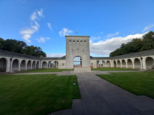 The memorial was designed by Sir Edward Maufe with sculpture by Vernon Hill. The engraved glass and painted ceilings were designed by John Hutton and the poem engraved on the gallery window was written by Paul H Scott. The Memorial was unveiled by The Queen on 17 October 1953.