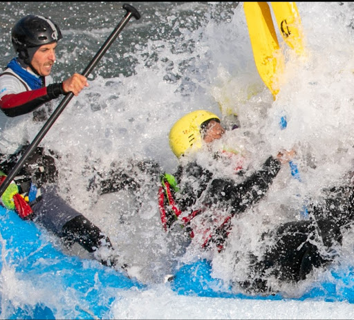 The group then gathers outside where instructors hangout the helmets, floating jackets. Following the kit distribution, you are given a briefing on the liabilities and requirements (including age and medical conditions) of the event which led to signing a standard release form. Once the forms are released you are taken to a safety briefing around how to use the raft and paddle including the procedure to get individuals that have fallen into the rapids back onto the raft. The group is then separated into smaller groups - each assigned to an instructor and a raft. The final procedure prior to jumping on the rafts is a swimming test. The swimming consists of jumping into the water, getting dragged downstream by the current and upon given instruction swim to the edge. It is a fun exercise and one that most people pass and enjoy as it gets the body going. Once these procedures are complete you jump into the rafts and conduct some basic training on the rafts including basic instructions such as getting down and turning. Once up and running and depending on the speed of the track, each session will consist of four to five runs down the circuit that get progressively more intense.
